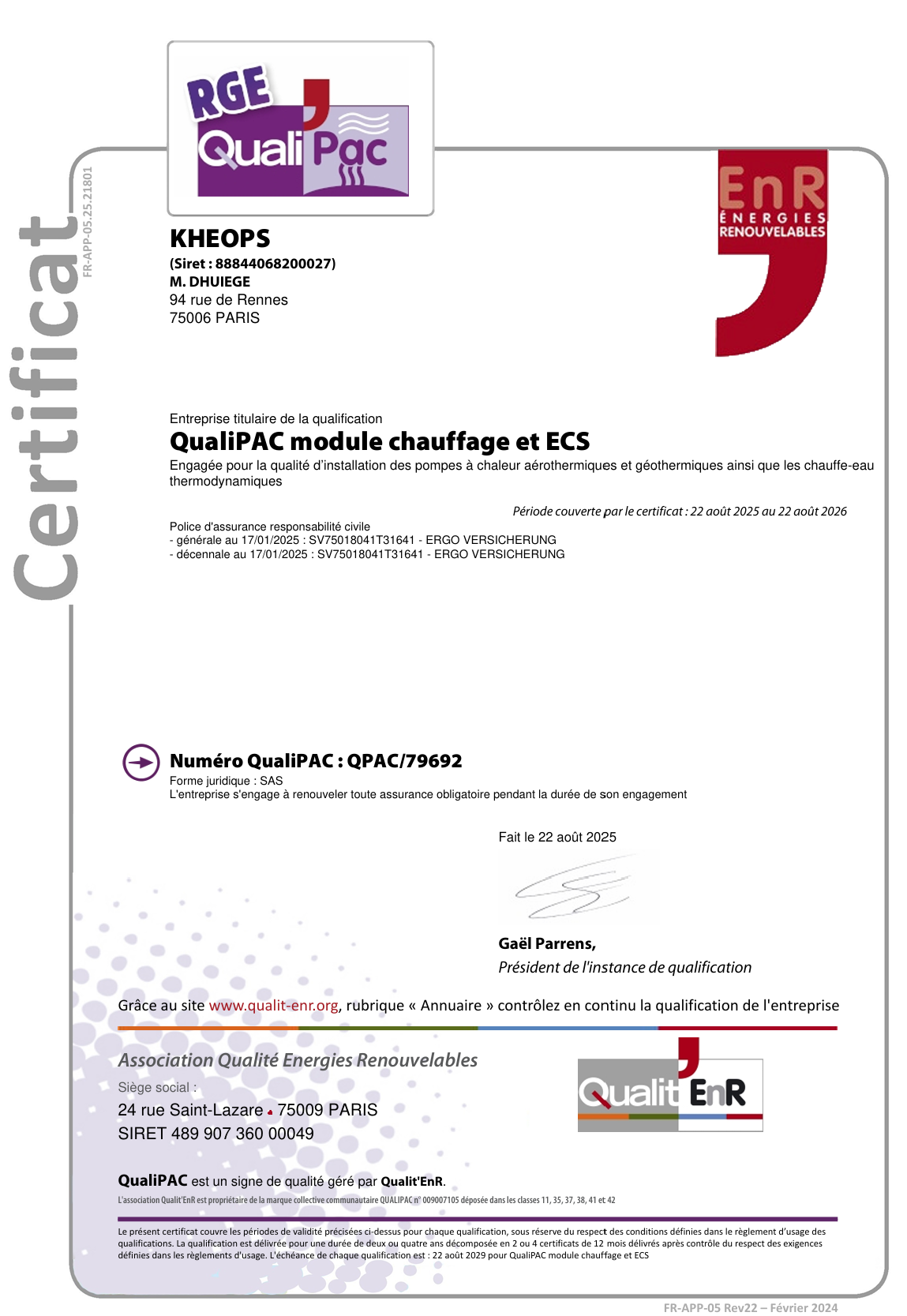 Clim Passion est certifiée pour la qualité d'installation des pompes à chaleur aérothermique et géothermique ainsi que que les chauffe-eaux thermodynamiques : https://www.qualit-enr.org/entreprises/kheops/